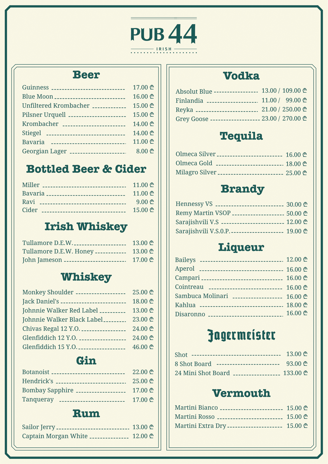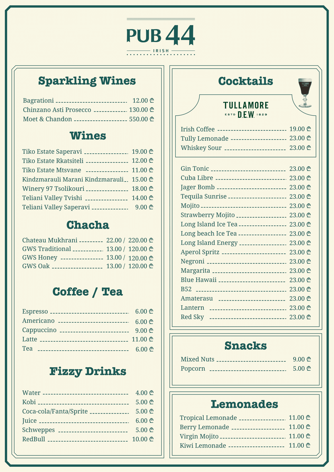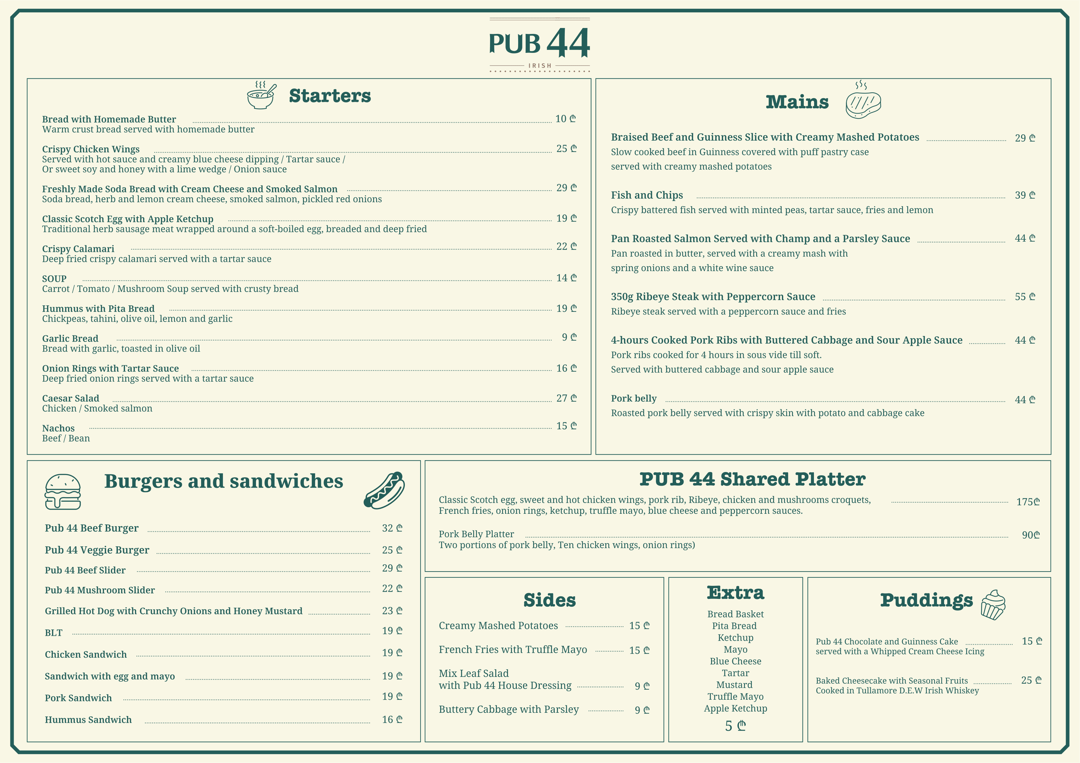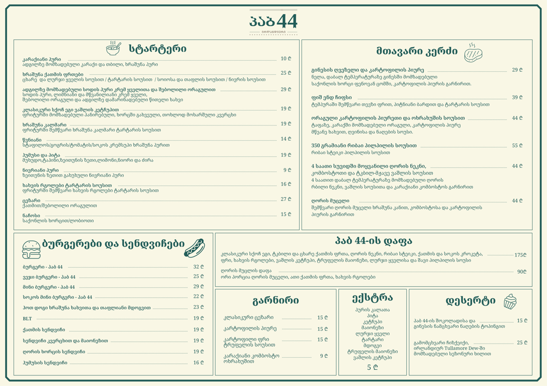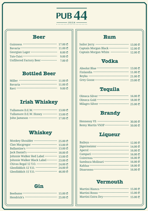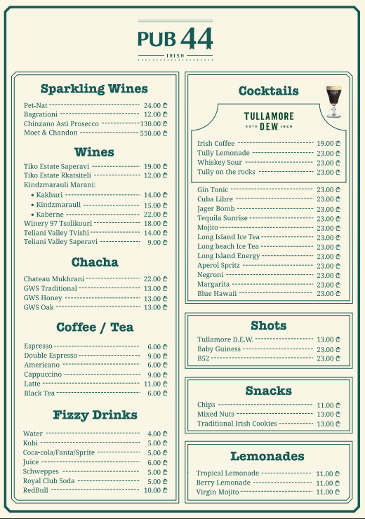 Welcome to PUB 44, the ultimate sports bar in the heart of Tbilisi's vibrant District Vera! Whether you are a die-hard sports fan or simply looking for a great place to unwind, PUB 44 has it all. Step inside and be greeted by a lively atmosphere perfect for cheering on your favorite teams. Our sports bar boasts not one, but two huge TVs, ensuring that you never miss a moment of the action. irish pub bar heart tbilisi fans bar cuisine enjoy . From exhilarating football matches to thrilling basketball games, our screens are always tuned to the latest live sports events, creating an electrifying ambiance that keeps you on the edge of your seat. PUB 44 is not just about sports; it's also an excellent destination for food and Alcohol.